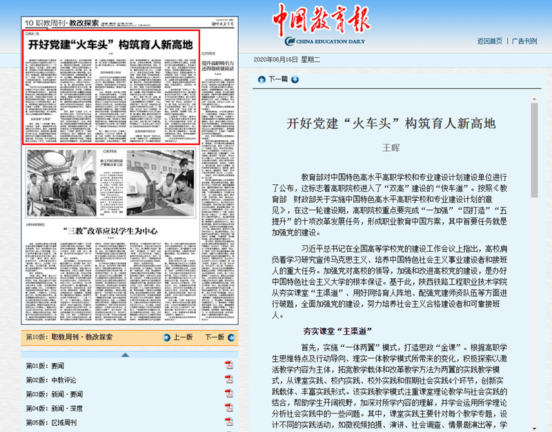 6月16日,《中国教育报》职教周刊发表党委书记王晖教授的署名文章,文章以“开好党建‘火车头’构筑育人新高地”为题,从夯实课堂“主渠道”、用好网络育人阵地、配强党建师资队伍等方面进行了阐释,讲述了陕铁院以党建为引领,全面建设中国特色高水平高职学校的经验做法。现将全文转载如下: