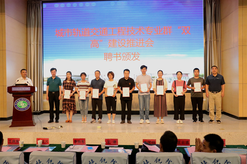 会上,双高办主任张团结宣读了《关于成立城市轨道交通工程技术专业群建设领导及工作组的通知》,城轨工程学院院长毛红梅布置了城轨专业群建设任务并介绍了任务分配的思路和原则。王津、李林军及各职能部门负责人向城轨专业群一级建设项目负责人颁发了聘书。