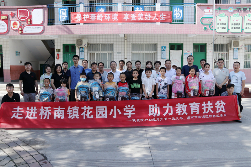为贯彻落实习近平总书记来陕考察重要讲话精神,学以致用开展党性实践活动,充分激发党员干部爱国爱党热情,增强党性修养,助力教育扶贫。6月29日下午,学校后勤党总支第一党支部携手临渭区政协区委组开展“走进桥南镇秦阳小学、花园小学,助力教育扶贫”特色党日活动。学校党委副书记车绪武、扶贫办副主任宋勇、后勤党总支第一党支部的全体党员以及渭南市临渭区政协副主席王珺青、临渭区政协区委组委员参加了活动。