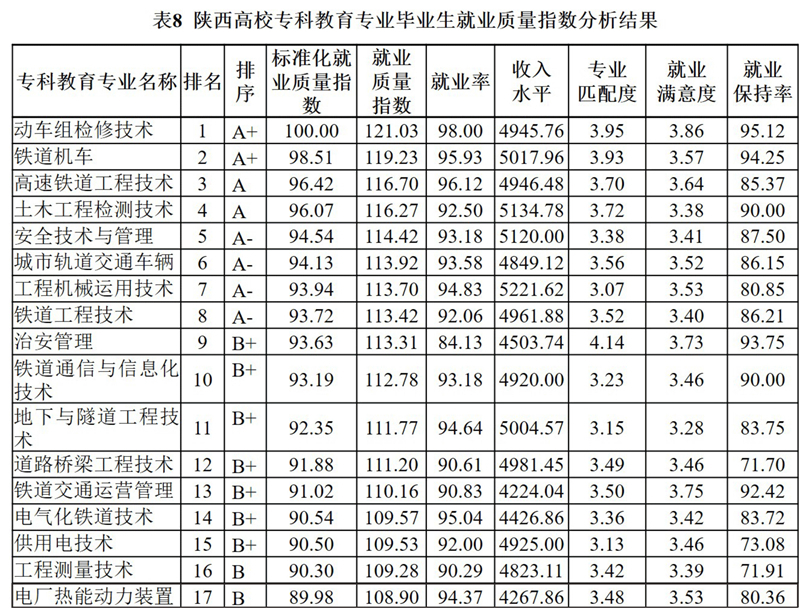 《报告》对陕西76个专科教育专业毕业生就业质量进行了评价,其中学校2019届毕业生所学专业铁道机车1个专业获评A+类专业;高速铁道工程技术、土木工程检测技术2个专业获评A类专业;安全技术与管理、工程机械运用技术、铁道工程技术3个专业获评A-类专业,占到全部A大类专业的75%。