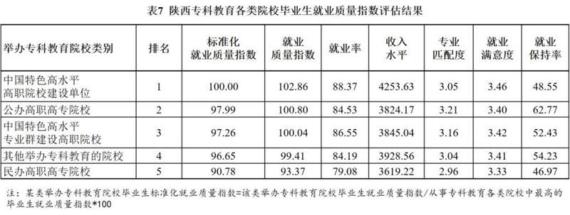 《报告》还对陕西60所从事专科教育的院校毕业生就业质量指数进行了评价,学校作为中国特色高水平高职学校建设单位,与其他3所院校以102.86的毕业生就业质量指数同时位居陕西省高职高专毕业生就业质量第一梯队。