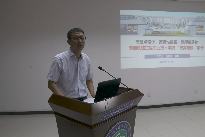 蒋平江代表学校对企业嘉宾的到来表示热烈欢迎,并从双高背景与基础-讲好陕铁故事、双高困惑与挑战-发挥陕铁智慧、双高内涵与路径-实施陕铁方案三个方面就学校双高建设情况作了详细介绍。他说,双高建设项目是在全国范围内集中力量建设50所左右高水平高职学校和150个左右高水平专业群,打造技术技能人才培养高地和技术技能创新服务平台,支撑国家重点产业,区域支柱产业发展,引领新时代职业教育实现高质量发展”。作为全国唯一以“铁路工程”命名的高职院校,始终秉承“根植铁路、立足西北、服务全国、走向世界”的使命,办学过程中始终坚持紧随铁路的专业集群发展、根植铁路的深度产教融合、铁军精神引领的文化育人三大特色,瞄准高端产业和产业高端,按照理念先行、整体设计、精准发力、全面推进的原则,实施“内涵发展、特色办学、提高质量”三步走战略,力求高起点设计、高标准建设、高质量落地,全面推进六大专业群建设和产教深度融合发展,树立新时代高职党建工作、学生素质教育、技能人才培养、应用技术服务、校企合作育人、院校治理水平、智慧校园建设、国际合作办学八大标杆,将学校建设成为支撑改革、引领发展、中国特色、世界水平的高水平高职学校。