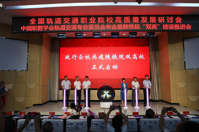 朱晓渭、高洁、安国勇、任少强、王晖、王津共同上台按下立柱按钮,启动水晶球,政行企校共建陕铁院“双高”校宣布正式启动。