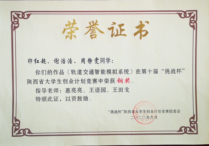 9月11日,由共青团陕西省委、中共陕西省委教育工委、陕西省科协、陕西省社科院、陕西省学联主办的第十届“挑战杯”陕西省大学生创业计划竞赛闭幕式在西安翻译学院成功举行。陕铁院5项作品入围决赛,其中《校园照明智能系统》获得银奖、《轨道交通智能模拟系统》、《基于村民能力评价的乡村产业发展研究》、《基于物联网+BIM技术的装配式建筑智能应用系统》、《受电弓高性能动态参数测试试验台》4项作品获得铜奖,学校获得优秀组织单位。