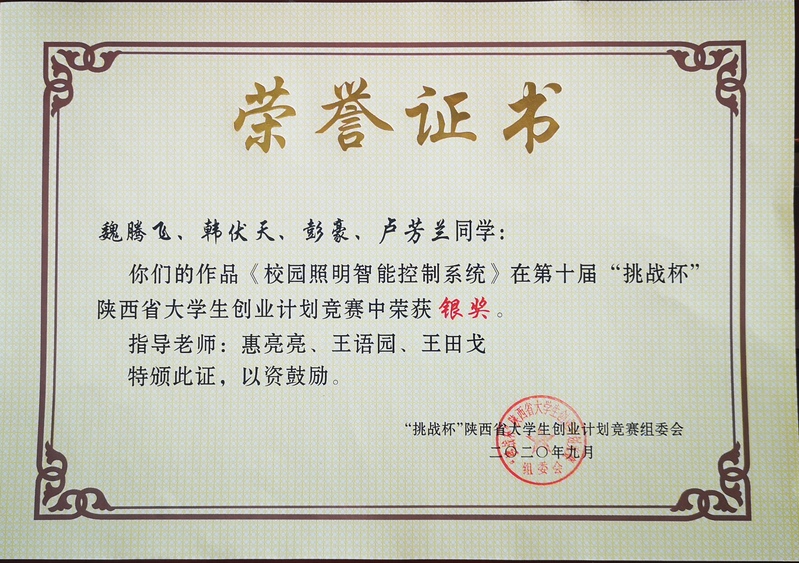 《校园照明智能系统银奖》银奖证书