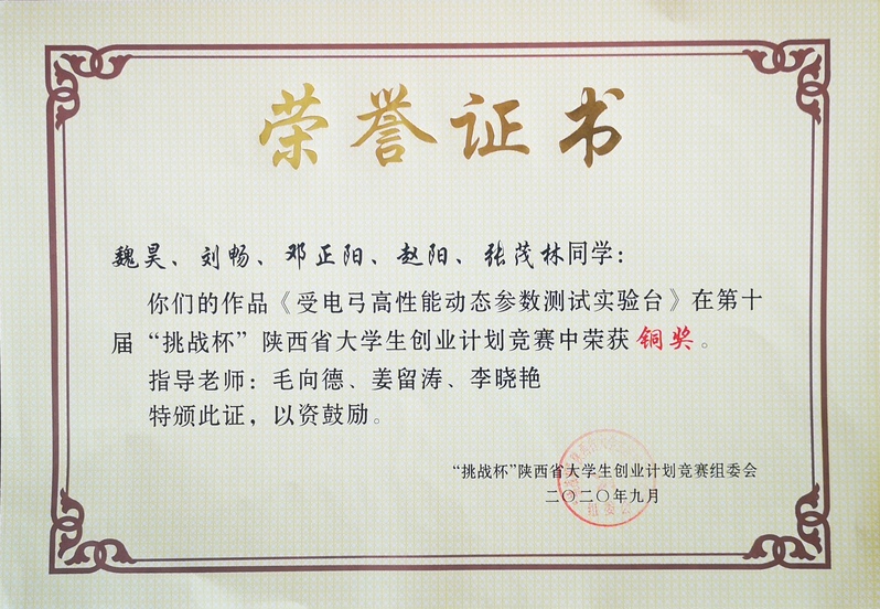 《受电弓高性能动态参数测试试验台》铜奖证书