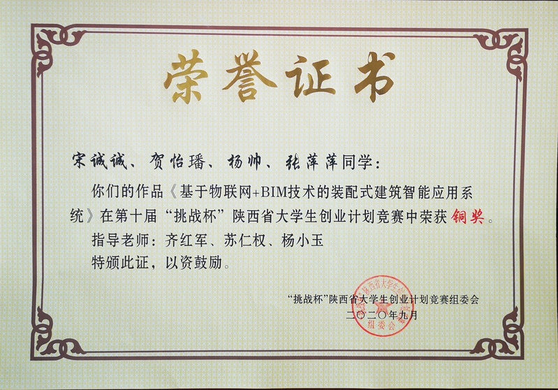 《基于物联网+BIM技术的装配式建筑智能应用系统》铜奖证书