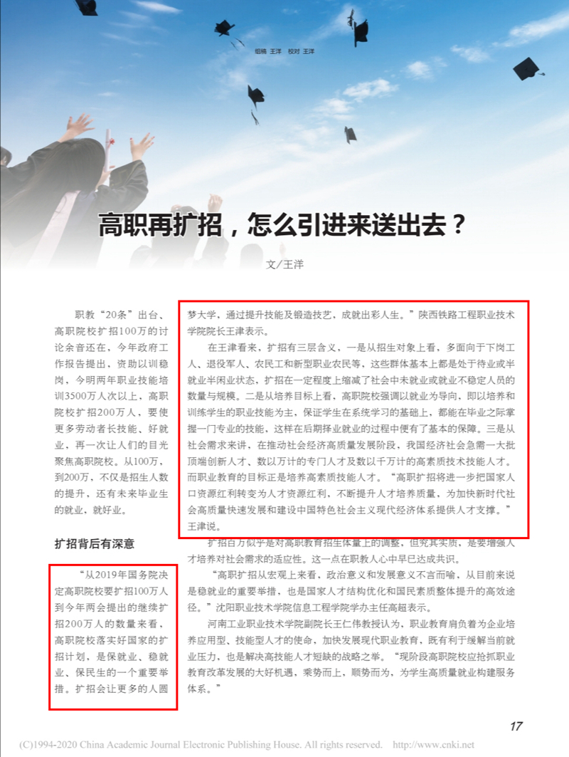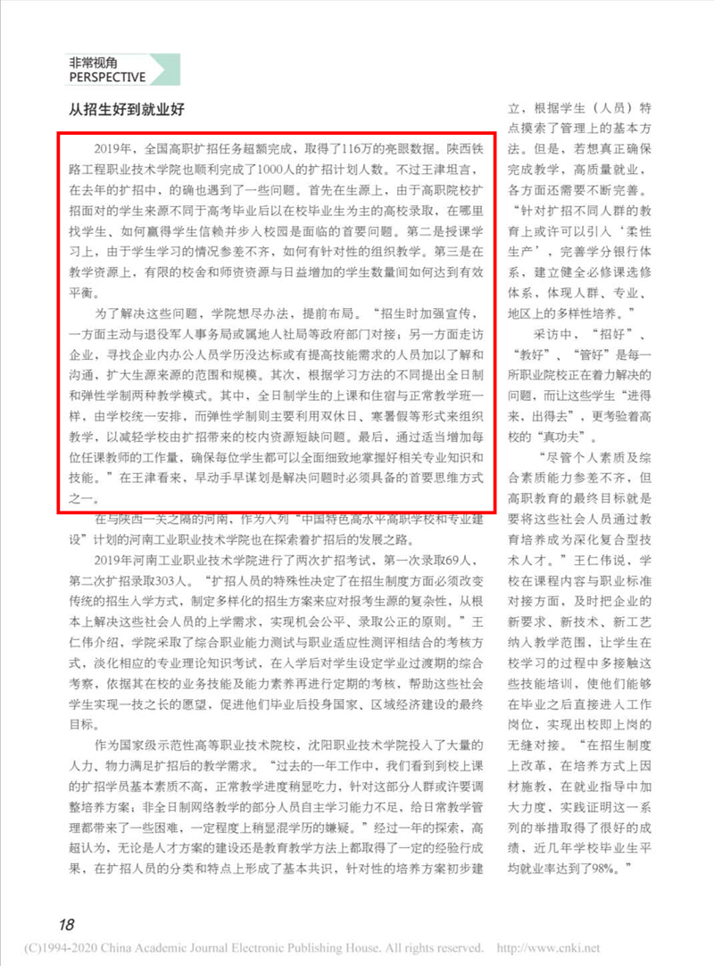 近期,学校党委书记王津就高职扩招接受《中国大学生就业》专访。他从扩招对象、培养目标及社会需求等方面进行了详细的阐释。他表示,建立具有中国特色的职教体系,营造崇尚劳动、重视技能的社会氛围,深化校企合作,出台政策调动企业参与的积极性这三点至关重要。该专访内容刊发于《中国大学生就业》2020年第16期,现将原文转载如下:
