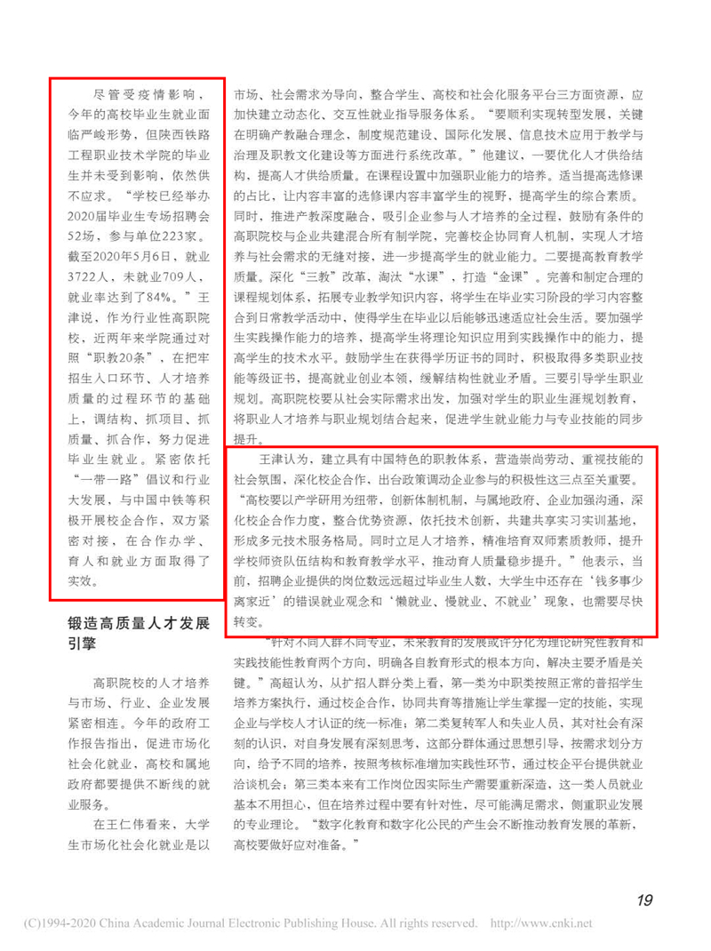 河南工业职业技术学院副院长王仁伟教授认为,职业教育肩负着为企业培养应用型、技能型人才的使命,加快发展现代职业教育,既有利于缓解当前就业压力,也是解决高技能人才短缺的战略之举。“现阶段高职院校应抢抓职业教育改革发展的大好机遇,乘势而上,顺势而为,为学生高质量就业构建服务体系。”