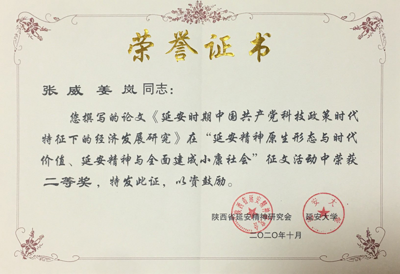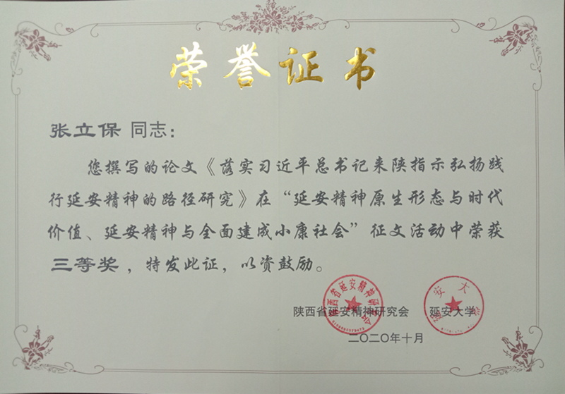会上还对优秀论文进行了表彰,经渭南市延安精神研究会选送的学校马克思主义学院副教授张威的论文《延安时期中国共产党科技政策时代特征下的经济发展研究》、张立保的论文《落实习近平总书记来陕指示弘扬践行延安精神的路径研究》分别荣获二、三等奖。本次征文从今年6月初开始,共征集文章近200篇,省延安精神研究会与延安大学共同组织专家评审,最终确定了51篇优秀文章,其中特等奖1篇,一等奖5篇,二等奖15篇,三等奖30篇。
