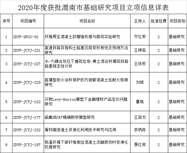 近日,渭南市科学技术局发布《关于下达渭南市2020年度重点研发计划项目的通知》(渭科发〔2020〕63号)。学校8个项目获批,每个项目获得科技局资助经费2万元,合计获得16万元科研经费支持。