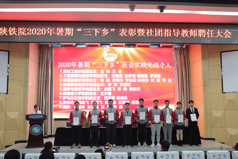 11月5日下午陕铁院在高新校区博爱厅召开了2020年暑期“三下乡”表彰暨社团指导教师聘任大会,会上对6个实践团队,五篇社会实践调查报告,29名先进个人,12名优秀指导教师,1个优秀组织单位进行了表彰。学校副校长贺建锋出席了会议,各学院党总支书记、团总支书记,教师代表、学生代表等600多人参加了会议。