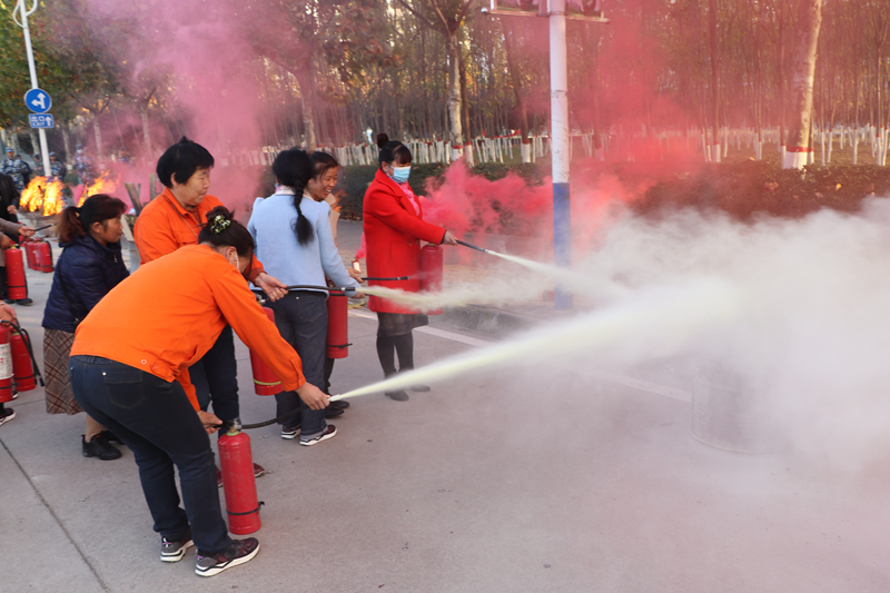 灭火实操演练中,学校学生公寓、餐饮中心和实验实训室工作人员代表及各二级学院学生代表在消防专业人士指导下,现学现用,快速提起灭火器摇匀,拔掉保险销,手握喷嘴对准火焰根部喷射,将“熊熊烈火”扑灭,以零距离互动的形式,亲身操作灭火器进行了灭火演练,现场气氛热烈高涨。