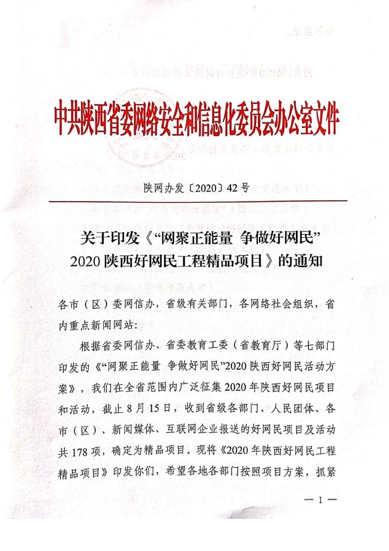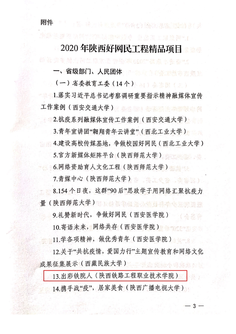 近期,中共陕西省委网络安全和信息化委员会办公室正式印发关于《“网聚正能量争做好网民”2020陕西好网民工程精品项目》的通知(陕网办发[2020]42号),其中共有来自11所高校的20个网络思政育人成果入选。学校党委宣传部申报的网络思政育人品牌“出彩铁院人”入选省级文化成果,是陕西省高职唯一。