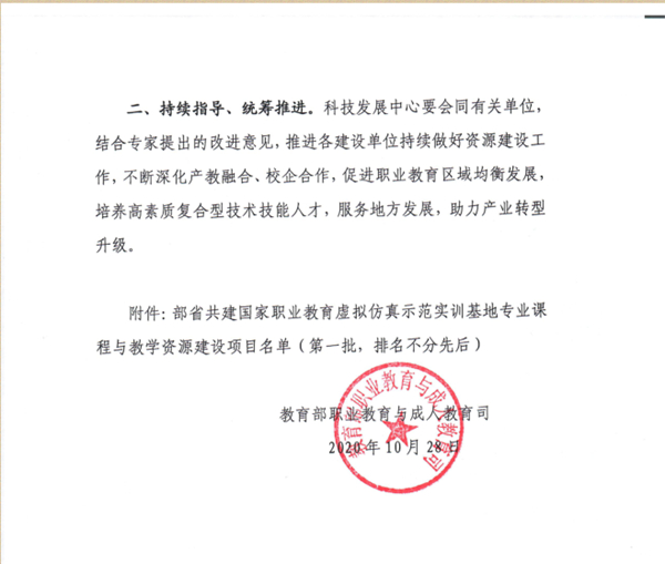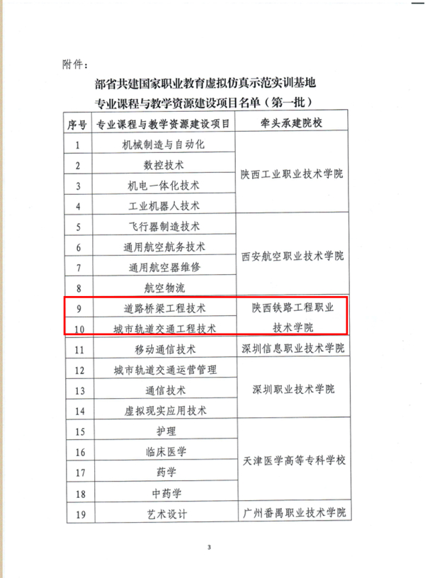 近日,教育部职业教育与成人教育司发布了《关于做好省部共建国家职业教育虚拟仿真示范实训基地专业课程与教学资源建设有关工作的通知》(教职成司〔2020〕34号),并对省部共建国家职业教育虚拟仿真示范实训基地专业课程与教学资源建设项目名单进行了公布,7所“双高计划”建设院校承担的19个项目获批立项,学校道路桥梁工程技术和城市轨道交通工程技术2个项目入选。