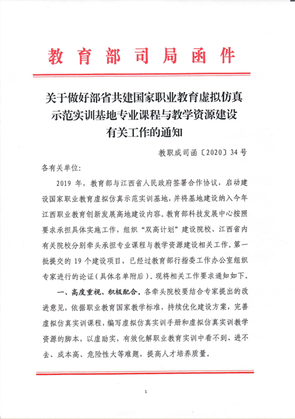 2019年,教育部与江西省人民政府签署合作协议,启动建设国家职业教育虚拟仿真示范实训基地,由教育部科技发展中心组织“双高计划”建设院校、江西省内有关院校分别牵头承担专业课程与教学资源建设工作。该项工作要求,承担第一批入选的19个项目建设任务的牵头院校要完善虚拟仿真实训课程,编写虚拟仿真实训手册和虚拟仿真实训教学资源的脚本,有效化解教育实训中的难题,提高人才培养质量,同时持续做好资源建设工作,不断深化产教融合、校企合作,促进职业教育区域均衡发展,培养高素质复合型技术技能人才,服务地方发展,助力产业转型升级。