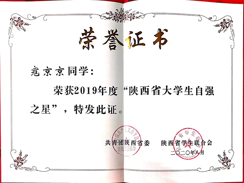 近日,根据共青团中央、全国学联的要求,共青团陕西省委学校部举办的2019年度寻访“陕西省大学生自强之星”活动结果揭晓,100名大学生获评“陕西省大学生自强之星”,学校运营3181班寇京京同学位列其中,并被推荐为“中国大学生自强之星”候选人。