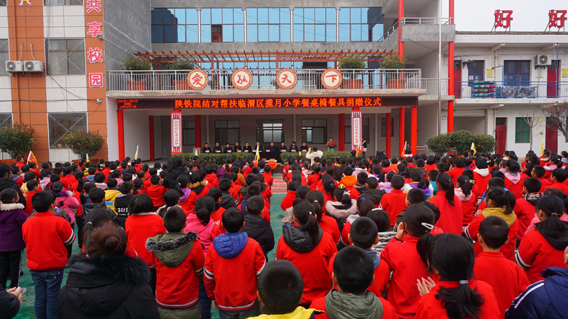 11月27日下午,学院党委副书记李林军率党政办、扶贫办、餐饮中心一行6人赴临渭区孝义镇揽月小学出席捐赠餐桌椅餐具仪式。临渭区教育局副局长李学斌、成教办主任关斌、扶贫办李战利,揽月小学董事长李建华、校长李晓霞出席大会。揽月小学600余名师生参加了捐赠仪式。
