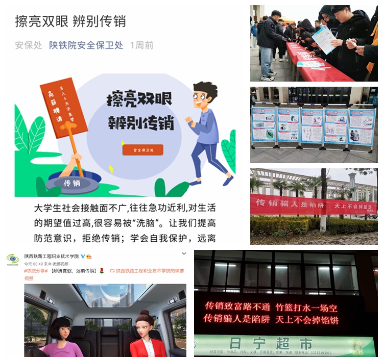 ——多渠道进行反传专题宣传。为了有效防止传销向校园渗透,切实增强师生识别防范抵制传销能力,学校还通过横幅、展板、电子屏、微信、微博和校内大屏等方式多渠道、全方位、立体式进行反传专题宣传,加强对师生的思想教育和法制教育。