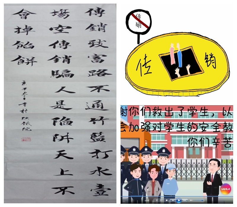 ——举行“揭传销骗局 保校园长安”主题作品征集活动。为了充分调动学生参与活动的积极性,有效发挥学生在反传销活动中的主动性,学校以“揭传销骗局 保校园长安”为主题,在广大学生中开展主题作品征集活动。学生踊跃参与,积极投稿,活动中收到学生反传销主题征文、宣传标语、漫画创作、微电影、动漫等各类作品共计一百余件。这些原创作品内容健康向上、紧扣主题、以小见大、微言大义,贴近学生、贴近实际、贴近生活,富有强烈的亲和力和巨大的感召力,有效揭露了传销骗人害人本质,提高了学生识别防范传销的能力。