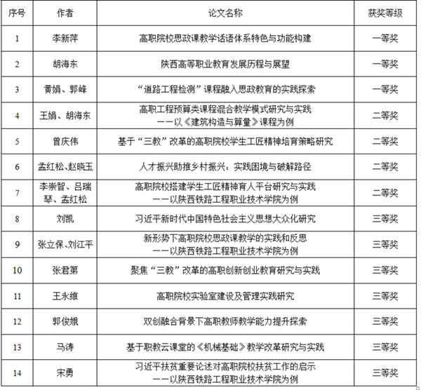 近日,陕西省职业技术教育学会下发《关于公布陕西省职业技术教育学会2020年度优秀职教论文评选结果的通知》(陕职学〔2020〕119号),学校共有14篇论文获奖,其中一等奖3篇、二等奖4篇、三等奖7篇。
