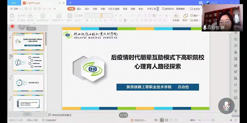 在“2020年度全国高职院校大学生心理健康教育优秀论文”评审中,学校教师吕泊怡《后疫情时代朋辈互助模式下高职院校心理育人路径探析》荣获优秀学术论文二等奖,其中一等奖共8篇,二等奖16篇,三等奖28篇。在专题讨论分论坛上,吕泊怡围绕学校疫情常态化防控形势下心理健康工作作“后疫情时代朋辈互助模式下高职院校心理育人路径探索”交流发言,全面分享学校朋辈心理育人实践体系建设经验和典型做法。这是继2019年后,学校第二次受邀在全国高职院校心理健康教育工作年会上作报告交流。