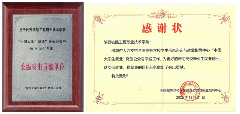 近日,全国高等学校学生信息咨询与就业指导中心、教育部《中国大学生就业》杂志社,授予学校“中国大学生就业”微信公众号2019-2020年度采编突出贡献单位,并颁发感谢状,对铁小匠网络文化工作学生团队提供的新媒体宣传业务支持表示感谢。