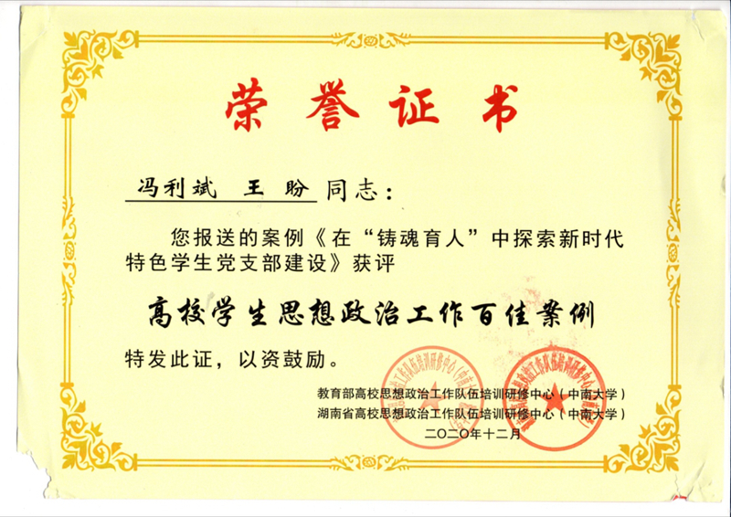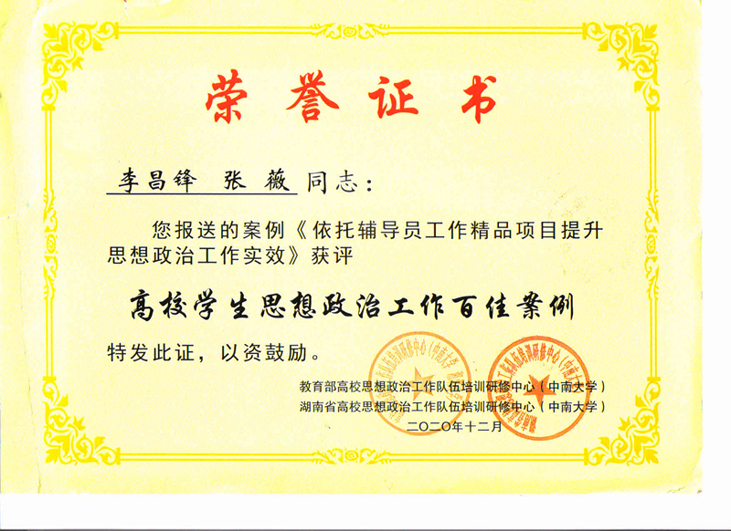 近日,教育部高校思想政治工作队伍培训研修中心(中南大学)公布了2020年高校学生思想政治工作百佳案例的遴选结果。由学校李昌锋、张薇申报的《依托辅导员工作精品项目提升思想政治工作实效》和冯利斌、王盼申报的《在“铸魂育人”中探索新时代特色学生党支部建设》的2篇案例,成功入选2020年高校学生思想政治工作百佳案例。