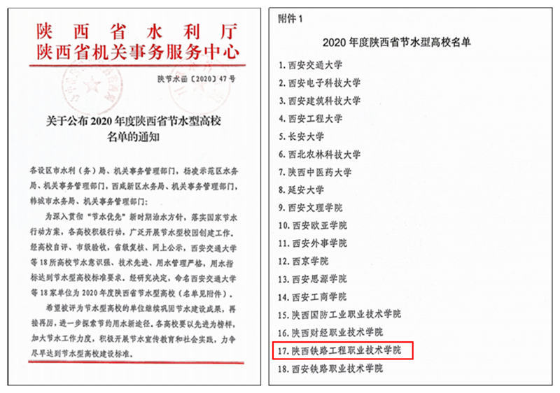 近日,陕西省水利厅、陕西省机关事务服务中心联合印发《关于公布2020年度陕西省节水型高校名单名单的通知》(陕节水函〔2020〕47号),认定陕铁院等18所高校为2020年度陕西省节水型高校。