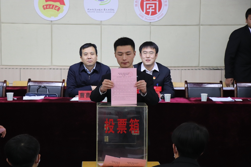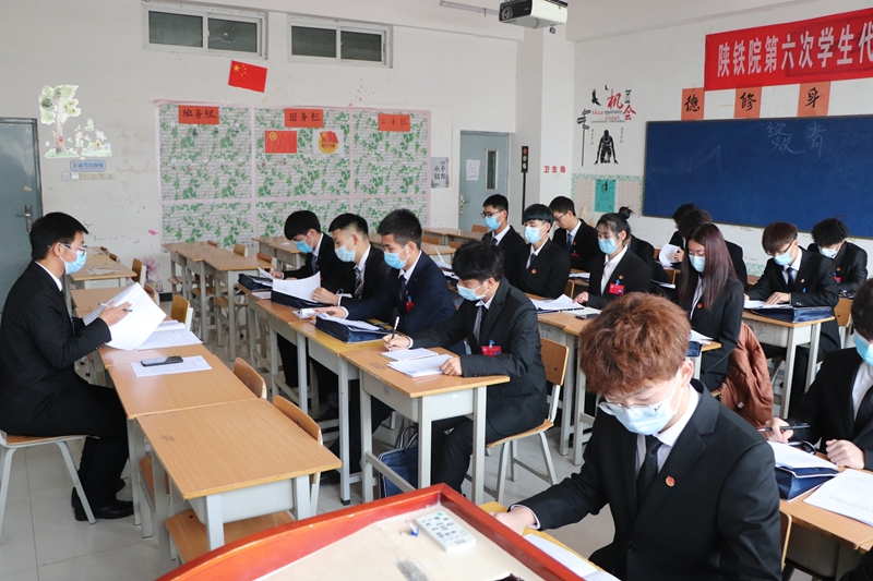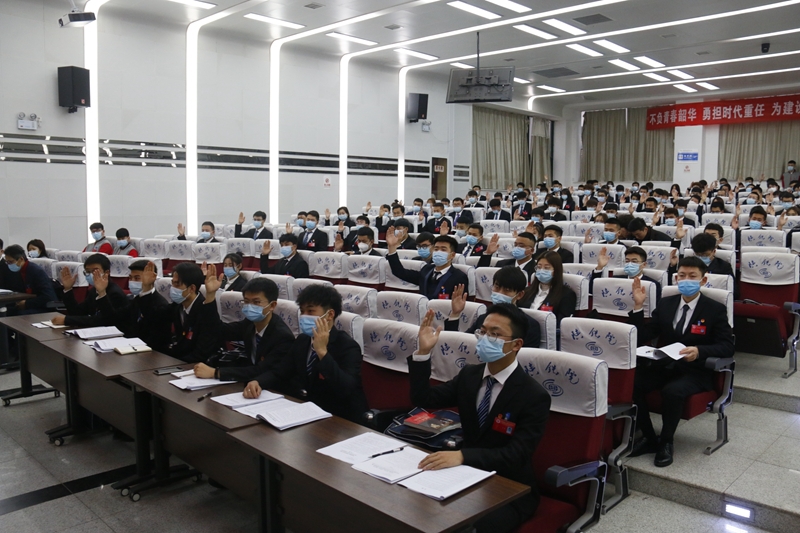最后,全体参会人员对工作报告进行审议与表决,并表决《陕西铁路工程职业技术学院学生会章程(草案)》、《陕西铁路工程职业技术学院学生会述职评议工作细则》(草案);以及大会选举的总监票人、监票人、总计票人、计票人名单,全票通过。
