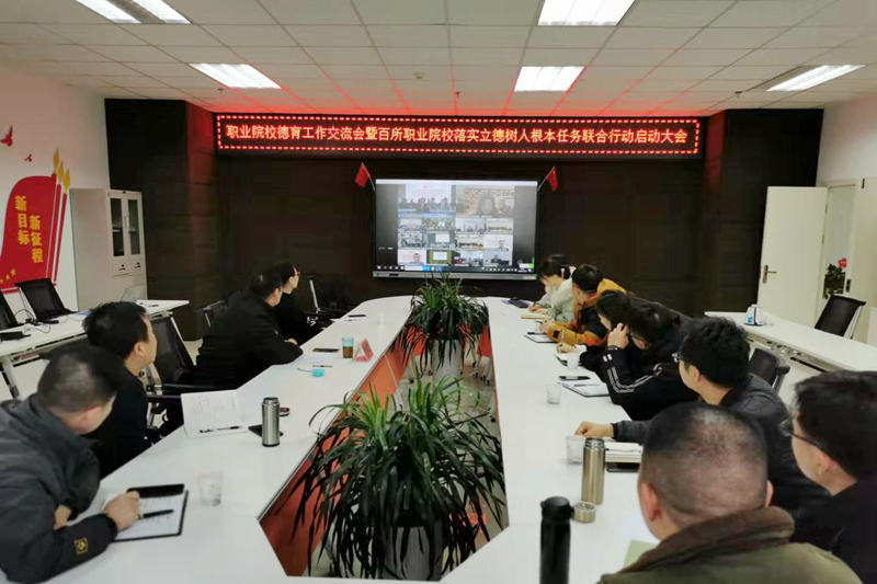 12月29日职业院校德育工作交流研讨会暨百所职业院校落实立德树人根本任务联合行动启动大会在线召开。教育部职成司二级巡视员、德育工作处处长刘英出席会议,参与联合行动的100余所高职院校代表在线参会,会议由广东轻工职业技术学院党委书记杜安国主持。学校作为联合行动成员校在高新校区马克思主义学院研习室设置了分会场,学校党委副书记李林军,党委宣传部、教务处、马克思主义学院、党委教师工作部、学工部、职业教育与产业发展研究院、校团委等部门代表参加会议。