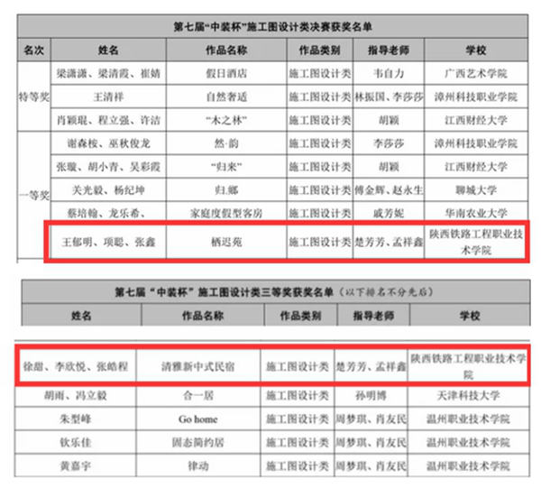 近日,中国建筑装饰协会公布第七届“中装杯”全国大学生环境设计大赛评选结果,学校桥建学院装饰学子荣获施工图设计一等奖、三等奖各一项。其中,王郁明、项聪、张鑫的作品《栖迟苑》(指导老师:楚芳芳、孟祥鑫)获得一等奖,徐甜、李欣悦、张皓程的作品《清雅新中式民宿》(指导老师:楚芳芳、孟祥鑫)获得三等奖。