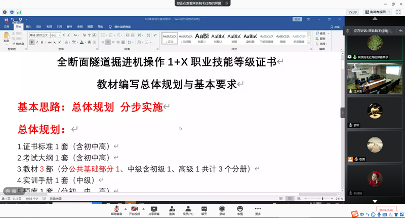 会上,学校城轨工程学院毛红梅、郭军、张小力等分别就《全断面隧道掘进机操作职业技能等级证书(中级)》配套教材的考试大纲、考核形式、教材提纲、教材编写体例样式、教材配套实训手册提纲及体例样式等进行了详细介绍,并就具体内容同与会专家进行了充分的研讨,听取了各方提出的建议和意见,有效地拓宽了教材编写内容及编写形式的思路、广度和深度,并就校企联合开发明确了分工与职责。此外,毛红梅对教材编写的总体规划、时间节点、具体要求做了详细的介绍,明确了教材基本理念、基本思路、开发模式、参照标准、术语使用、参编人员资历要求、教材审核程序等内容。