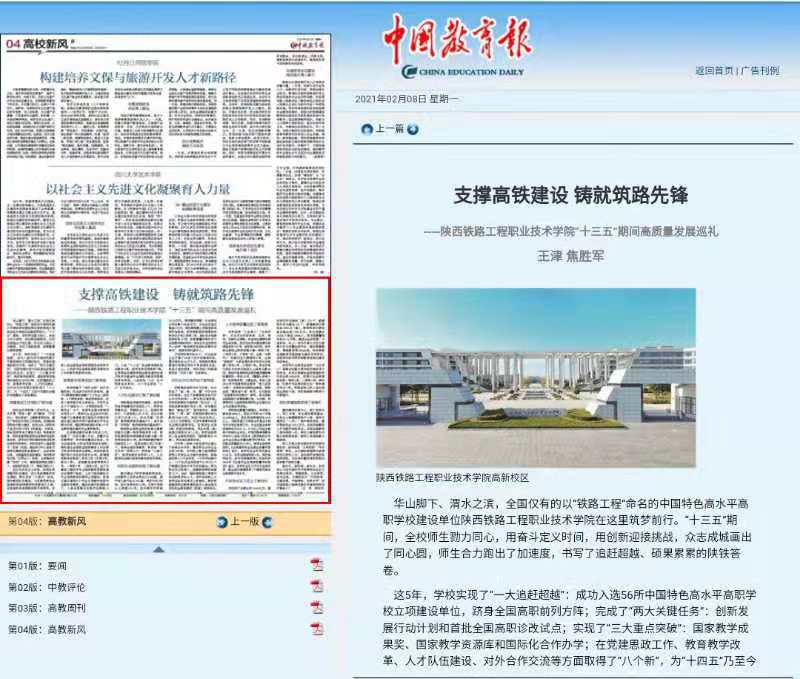 2月8日,《中国教育报》第四版高校新风刊发校党委书记王津、校长焦胜军署名文章《支撑高铁建设, 铸就筑路先锋——陕西铁路工程职业技术学院‘十三五’期间高质量发展巡礼》。文中展示了“十三五”期间,全校师生员工发扬“吃苦奉献、拼搏争先”的学院精神,书写了追赶超越、硕果累累的陕铁答卷。现将全文转载如下:
