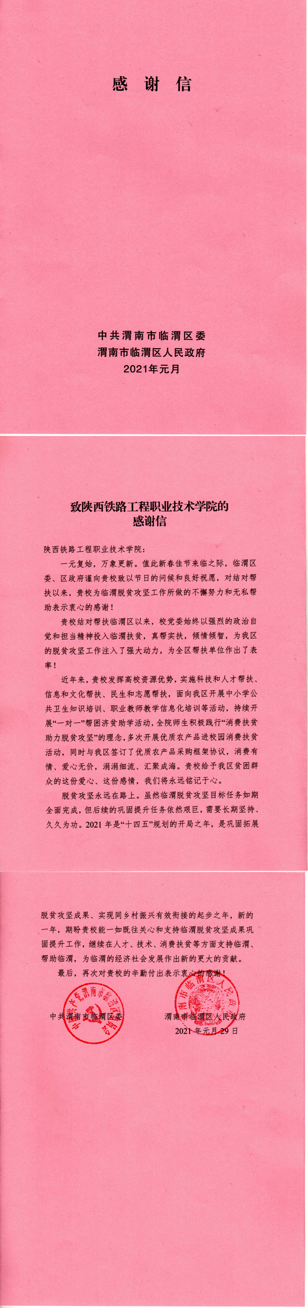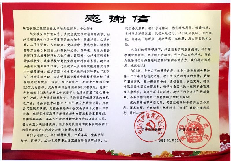 日前,中共洋县县委、洋县人民政府,中共临渭区委、临渭区人民政府发来感谢信,对我校四年来为洋县和临渭区脱贫攻坚工作做出的突出贡献表达衷心的感谢。