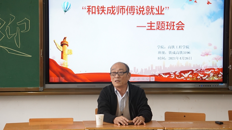 4月26日下午,全国劳动模范窦铁成走进高铁工程学院GB338教室,为铁成高铁3196班学生作“和铁成师傅谈就业”的主题班会。班会由高铁工程学院党总支书记李昌锋主持。