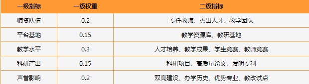 本次高职专业评价指标体系共分为三级,其中一级指标包括师资队伍、平台基地、教学水平、科研产出和声誉影响5个方面,二级指标包括专任教师、教学团队、教研基地、人才培养、资源库建设、学生竞赛、教改试点等16个方面,三级指标包括教指委、行指委、名师先进、实训基地、教学成果、技能大赛、教学竞赛、教改试点、产教融合、创新创业、双高建设、办学历史、1+X证书等36个方面,涉及70多个数据观测点。