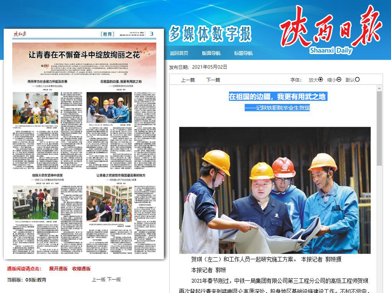 5月2日,《陕西日报》第3版教育版全版以《让青春在不懈奋斗中绽放绚丽之花》为题报道了4所高校的师生个人或团队在各自岗位上建功立业的典型事迹,其中以《在祖国的边疆,我更有用武之地》为题报道了学校毕业生贺琪投身地区基础设施建设工作,在祖国边疆奉献青春的故事,现将全文转载如下: