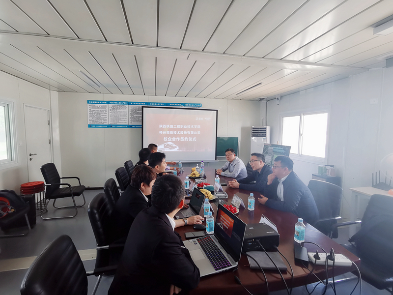5月8日上午,祝和意一行又赴河北廊坊神州高铁轨道交通检修技术及工业服务中心基地进行调研。在基地施工现场,神州高铁教育分公司副总经理孙雪亮讲解了该基地的建设进度、设计功能等内容,随后双方围绕合作开展“1+X”职业技能等级证书推广、共建智能轨道交通实训基地、联合开展专业技术科研及课程研发等内容进行了深入交流,双方签订了校企合作框架协议,为后期双方进一步合作奠定了良好的基础,助力学校轨道交通智能运维相关专业的发展。