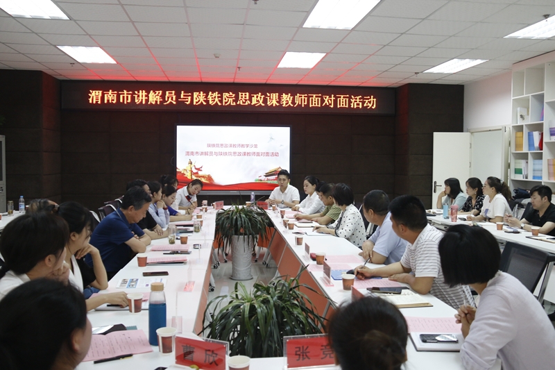为深入贯彻习近平总书记在党史学习教育动员大会上的讲话精神,进一步提高思政课教师的教学能力,提升思政课教学的实效性,6月3日下午,学校在马克思主义学院研习室举办了渭南市讲解员与思政课教师面对面交流活动。来自渭南市博物馆、渭南市渭南广播电视台、韩城市司马迁祠、潼关县天翼旅游文化有限责任公司、陕西省荣誉军人康复医院、潼关县融媒体中心、澄城县博物馆、大荔县退役军人事务局、蒲城县文化和旅游局、富平县文化和旅游局的10名优秀红色故事讲解员同全体思政课教师进行了座谈交流。渭南市延安精神研究会会长雷民康、副会长柴树明、办公室主任杨忠定,校党委书记王津、副书记李林军出席活动。活动由马克思主义学院院长李新萍主持。