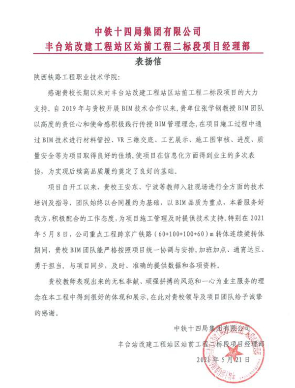 近日,学校主持完成的BIM项目喜获业主单位中铁十四局集团有限公司丰台站改建工程站区站前工程二标段来信表扬,称赞学校张学钢教授带领BIM团队在公司重点工程跨京广铁路转体连续梁成功转体期间,严格按照项目进度统一协调,加班加点、通宵达旦、勇于担当,与项目进程同步,及时准确提供各项数据资料,在监控管理、信息共享、资源调配上,为连续梁转体的顺利完成提供了保障。该项目部对学校BIM团队无私奉献、顽强拼搏的精神和全心全意为业主服务的理念表示诚挚感谢。