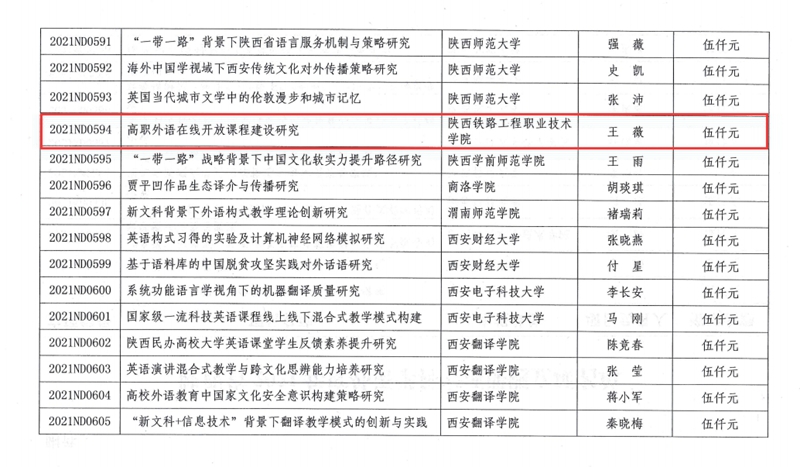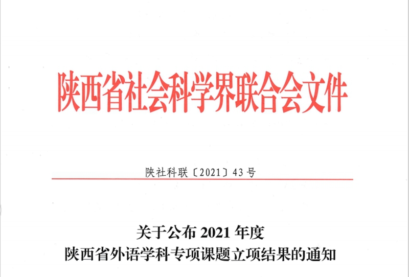 陕西省社会科学界联合会6月4日公布了《关于公布2021年度陕西省外语学科专项课题立项结果的通知》(陕社科联【2021】43号)文件,其中学校基础课部王薇老师申报的《高职外语在线开放课程建设研究》获批立项,并获得省社科联5千元经费支持,实现了学校在陕西省社会科学界联合会外语学科专项项目立项零的突破。