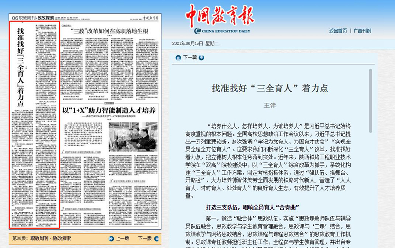 6月15日,《中国教育报》职教周刊教改探索刊发学校党委书记王津教授署名文章《找准找好“三全育人”着力点》。文章围绕“培养什么人、怎样培养人、为谁培养人”这一根本问题,以陕西铁路工程职业技术学院为例,从打造三支队伍,唱响全员育人“合奏曲”; 筑牢四大阵地,绘制全过程育人“同心圆”;实施六大工程, 打好全方位育人“组合拳”三个维度,深入阐释了学校的“三全育人”综合改革实践。现将全文转载如下: