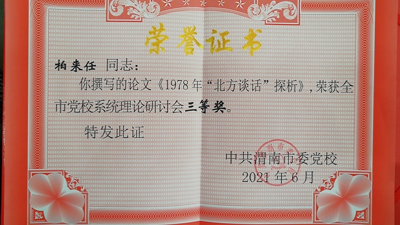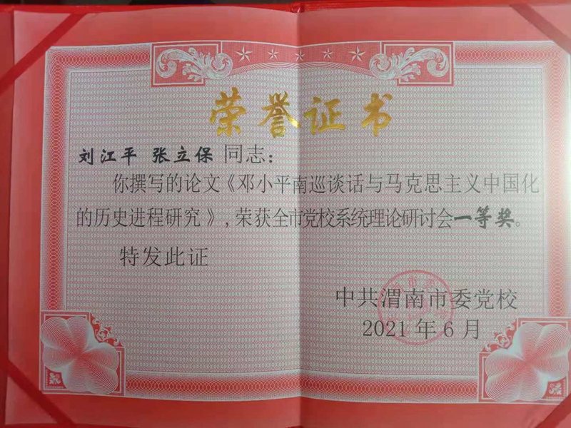 会上对24篇优秀论文进行了表彰,市委党校常务副校长王恒作了讲话。学校马克思主义学院刘江平、张立保两位老师撰写的《邓小平南巡谈话与马克思主义中国化的历史进程研究》论文荣获一等奖,张立保老师撰写的《党中央在延安十三年的历史经验与当代启示》论文荣获二等奖,柏来任老师撰写的《1978年“北方谈话”探析》论文荣获三等奖。马克思主义学院荣获征文组织工作先进单位奖。