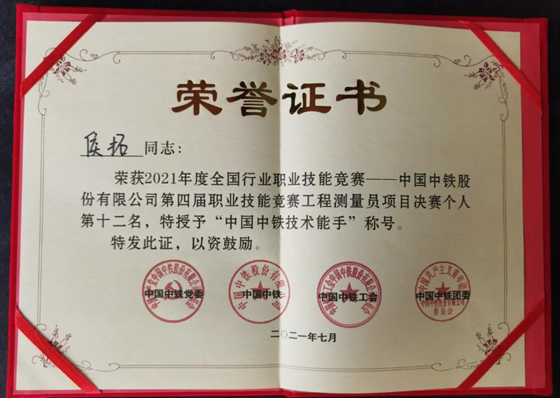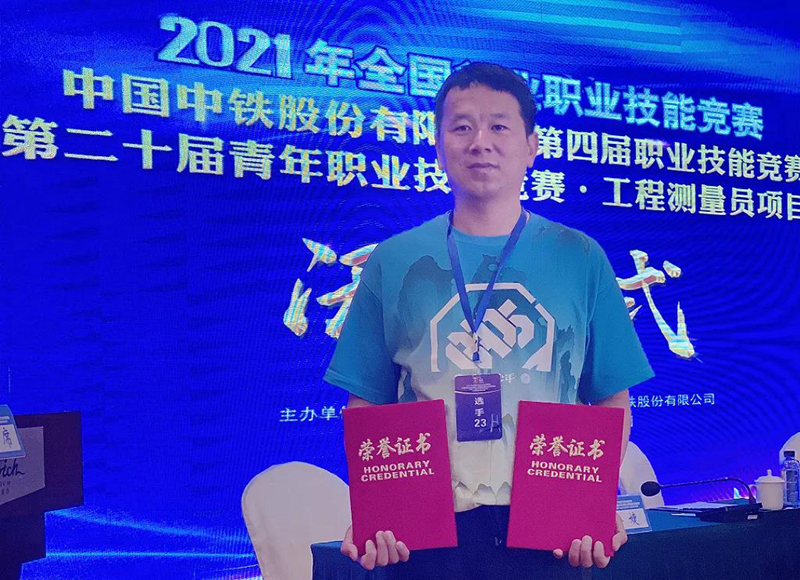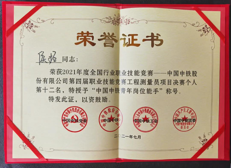 7月19日,中铁北京工程局一公司精密测量中心侯拓(学校测量3134班学生)在2021年全国行业职业技能竞赛、中国中铁第四届职业技能竞赛暨第二十届青年职业技能竞赛工程测量员项目决赛中荣获个人第十二名,被授予“中国中铁技术能手”和“中国中铁青年岗位能手”称号。