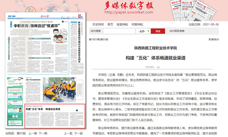 8月26日,《陕西工人报》第3版以《陕西铁路工程职业技术学院构建“五化”体系畅通就业渠道》为题,从就业管理规范化、就业指导系统化、就业服务亲情化、就业信息网络化、就业参与全员化五个方面报道了学校全面构建“五化”就业服务体系,使学校的就业率连续保持在95%以上。现将全文转载如下: