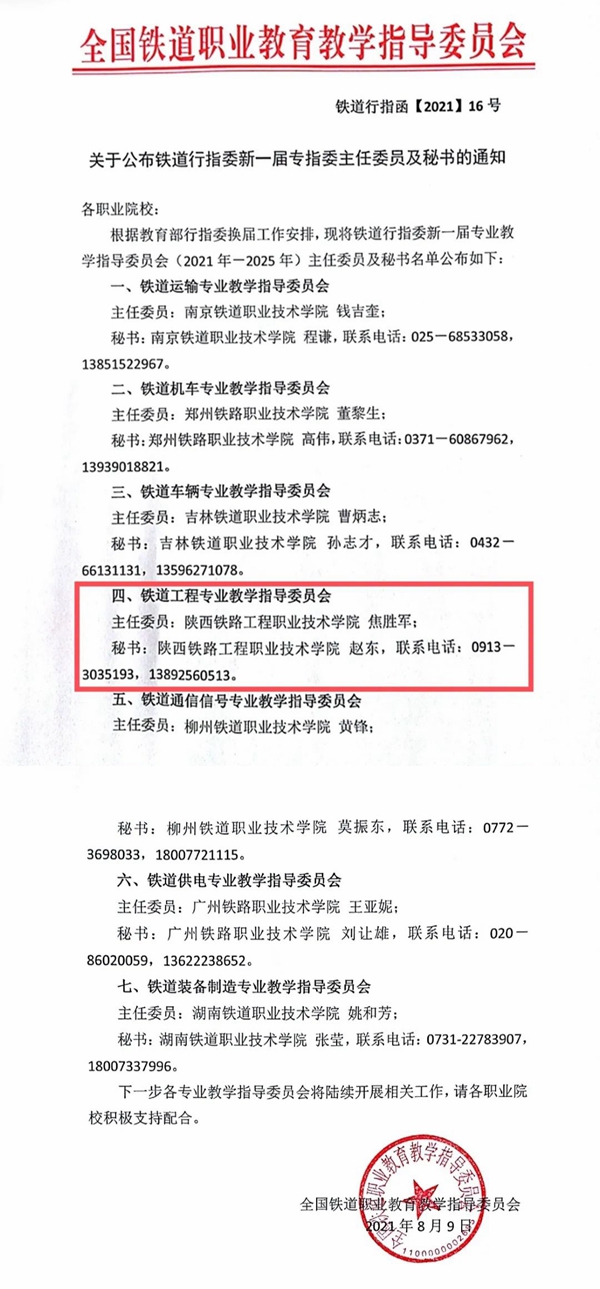 近日,铁道行指委新一届专业教学指导委员会(2021年-2025年)主任委员及秘书名单公布。学校校长焦胜军当选为铁道工程专业教学指导委员会主任委员,学校高铁工程学院院长赵东当选为铁道工程专业教学指导委员会秘书,全国共有14名教育工作者入选。