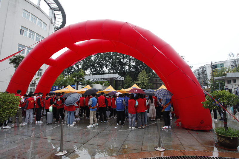 志愿者排队等候新生入校,“一对一”为新生服务