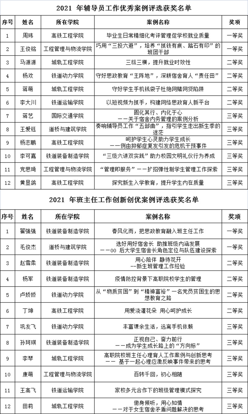 2021年6月,学校面向全体专职辅导员、学生工作办公室主任、兼职班主任开展了辅导员工作优秀案例、班主任班级管理工作创新创优案例评审活动。经各学院初评,共推荐了辅导员工作优秀案例32例、班主任班级管理工作创新创优案例40例。学工部组织校内专家评委对2类工作案例进行匿名评审,经学院初评、专家匿评,辅导员、班主任工作案例各评选出三等奖6名,二等奖4名,一等奖2名。会后,副校长祝和意对本次工作案例进行了点评,充分肯定我校学工团队以学促用、以用促学,学用结合的业务水平,希望在今后的工作中全体学工团队向着更加精细化、职业化、专业化的方向持续发展。