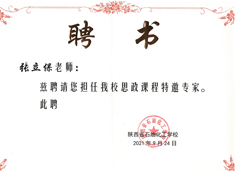 会上,张立保受聘为陕西省石油化工学校思政课特邀专家,陕西省石油化工学校副校长李应松为其颁发了聘书。(赵宵迎)